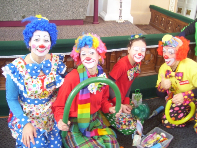 Talsu kristīgie klauniņi ar izrādi viesojas Svētdienas skolas atvērto durvju dienā